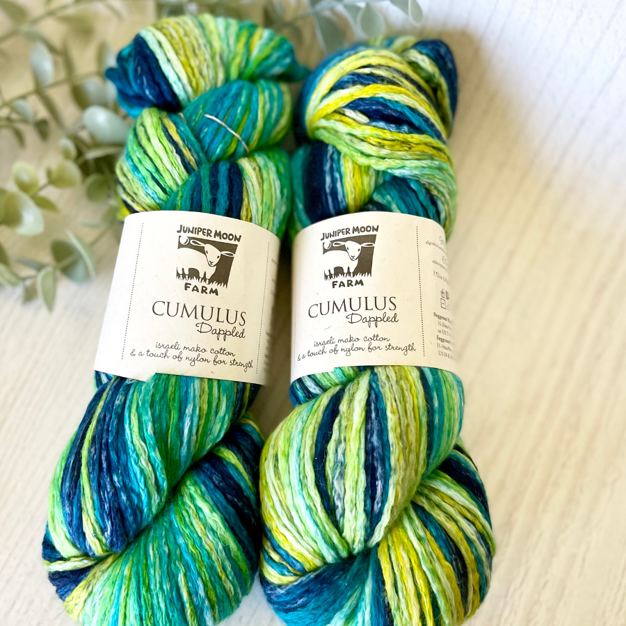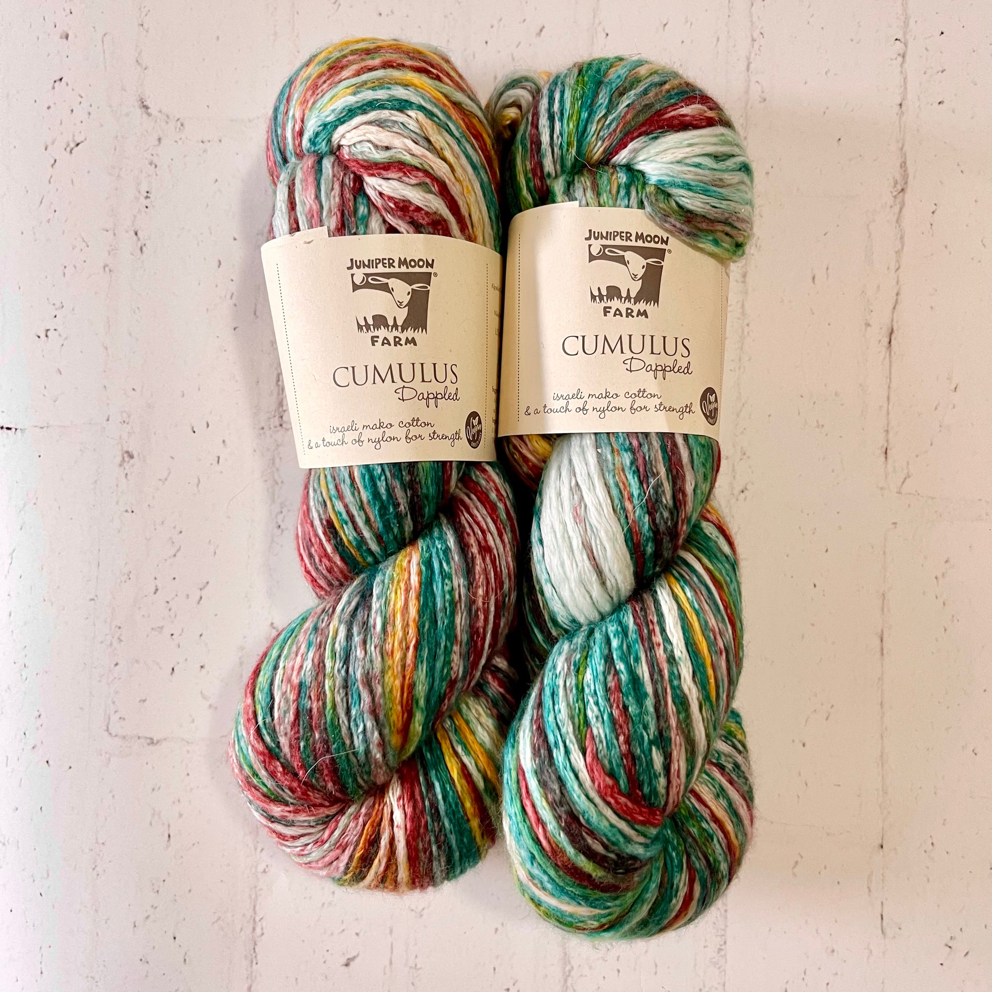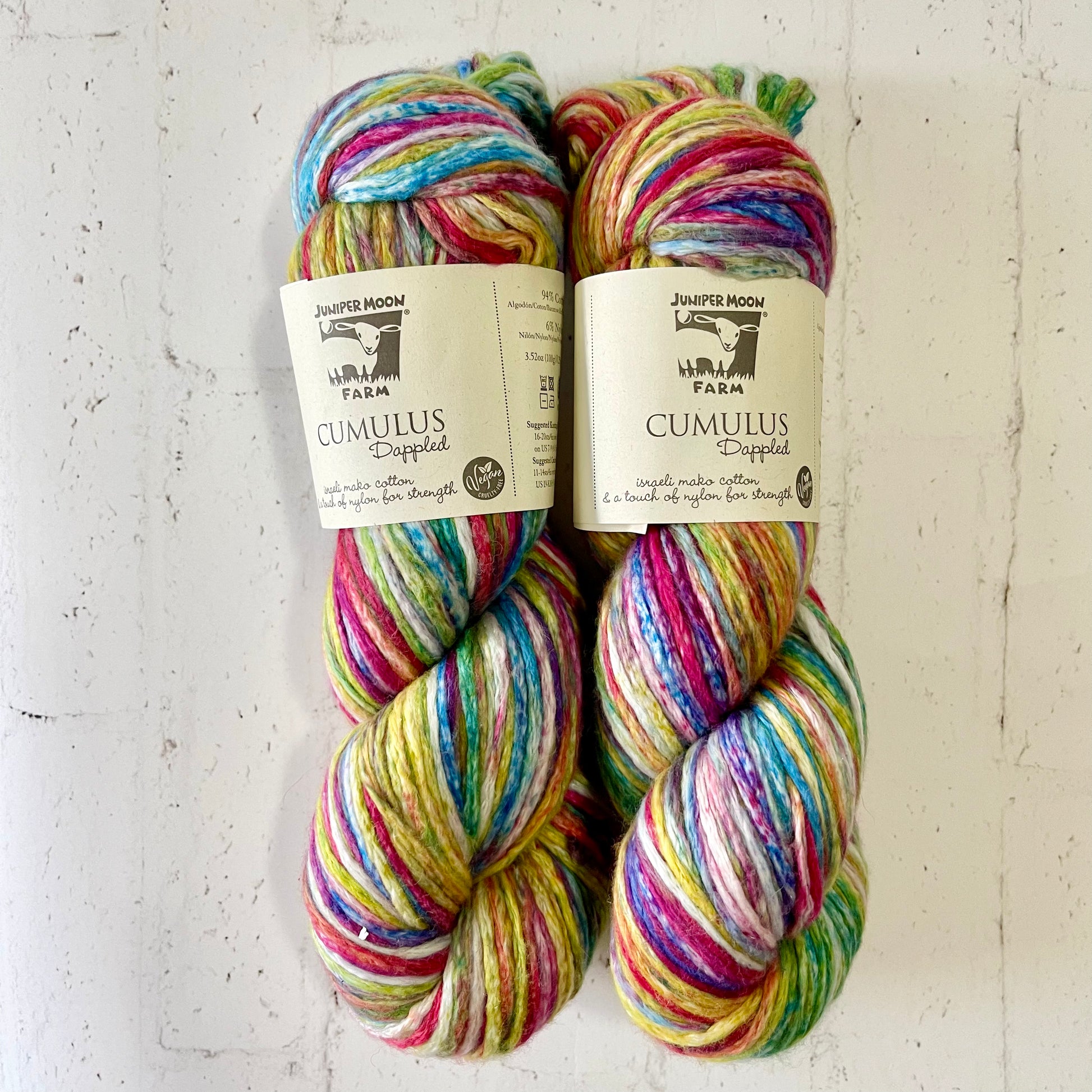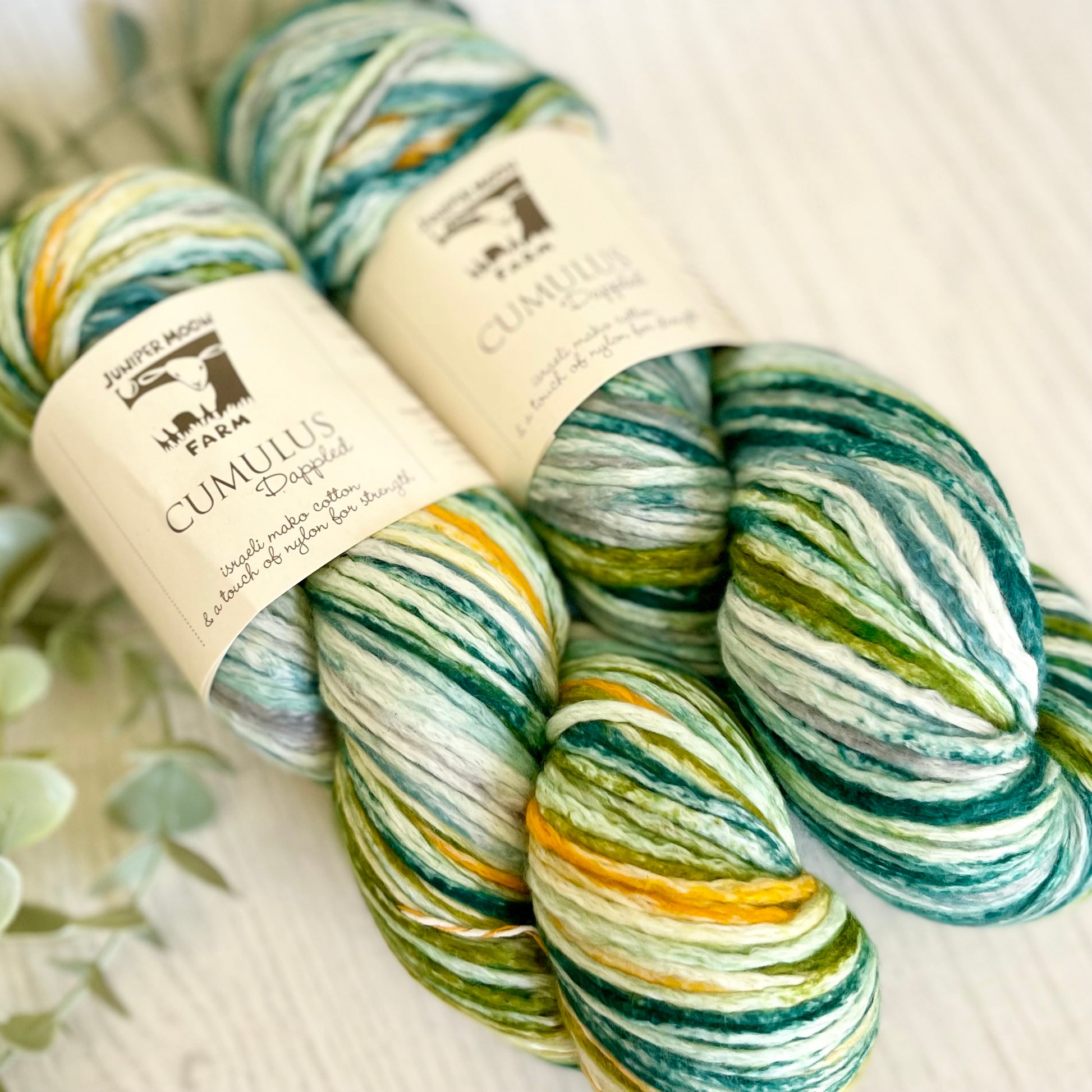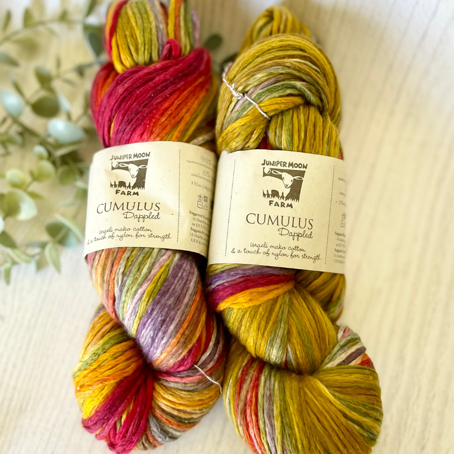 Juniper Moon Farm Cumulus is one of the loftiest, softest and most scrumptious cotton yarns we've ever had on our needles or hooks! This Israeli Mako Cotton blend is as soft as a kitten! The long staple length of Mako cotton is the highest quality fiber. Light as a feather, Cumulus is perfect for baby blankets and garments, and it is next-to-skin soft for scarves and shawls too!