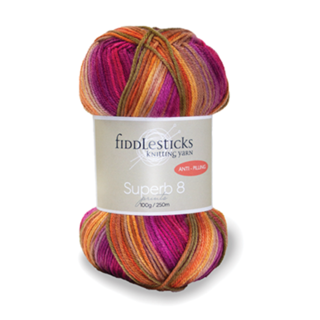 Fiddlesticks Superb 8 Prints is the latest in the Superb 8 range. This 8ply (DK) yarn is 100% anti pilling acrylic and comes in a delightful blend of colours which is sure to add joy to any project.