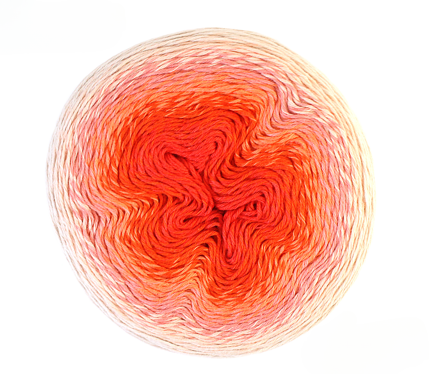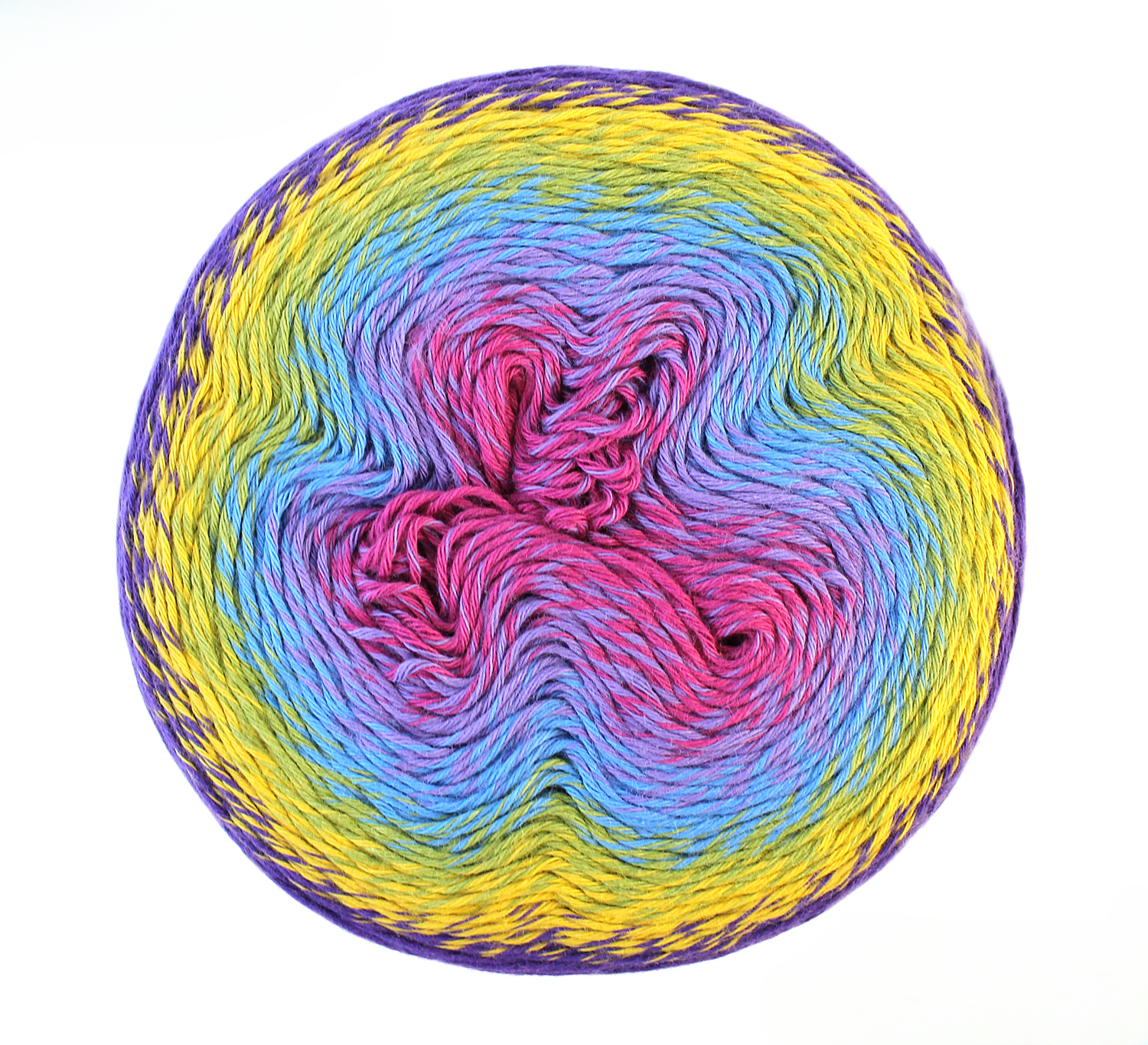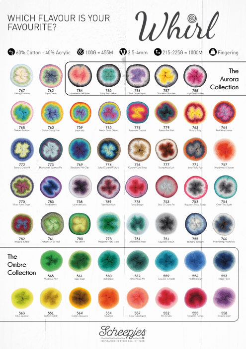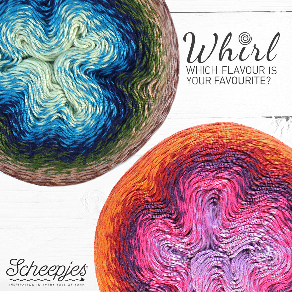 Scheepjes Whirl is a delicious gradient yarn from Scheepjes and comes in 54 scrumptious colour ways. Made from a blend of 60% Cotton / 40% Acrylic to produce projects that are lightweight and breathable. Unlike other gradient yarns, Whirl has a generous twist to enable speed while working the yarn and to help prevent splitting. The beautiful drape of this yarn makes it perfect for shawls, accessories, garments and stylish home décor projects. Whirl has a unique twisted plied section, which gives it a characteristic ‘flavour’ all of its own! The Extra Large yarn cake holds an enormous 1000 meters of softly colour changing yarn, more than enough for a large shawl or wrap. Each colour change is carefully tied in an optimum way to ensure the knot can be discreetly hidden within your stitches.